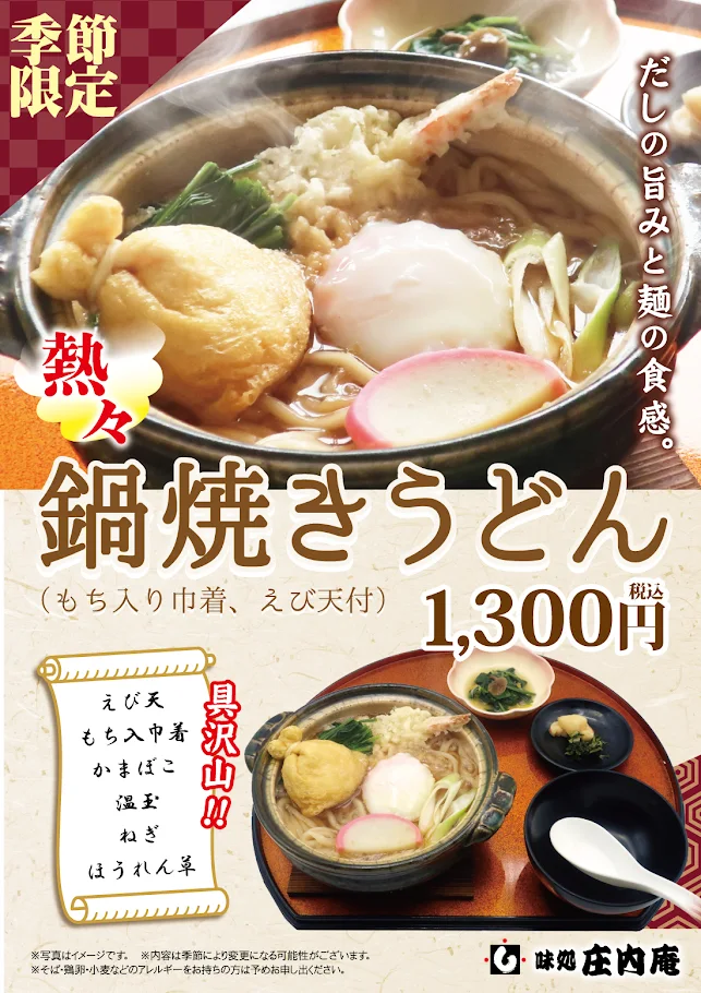 庄内庵では大好評の鍋焼きうどんが始まりました。熱々の土鍋に海老の天麩羅や餅巾着も入ってボリューム満点! 季節限定ですので是非ご賞味下さい。