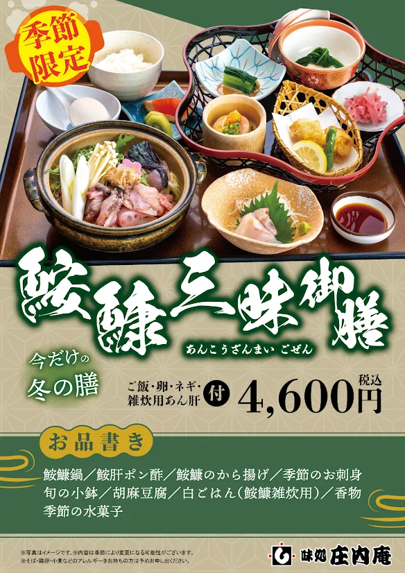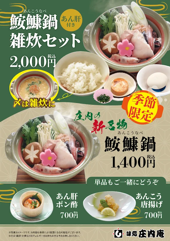 庄内庵では鮟鱇汁が始まりました! 大人気の鮟鱇雑炊や鮟鱇三昧をご用意しております。 是非、冬の味覚をお楽しみください☺️